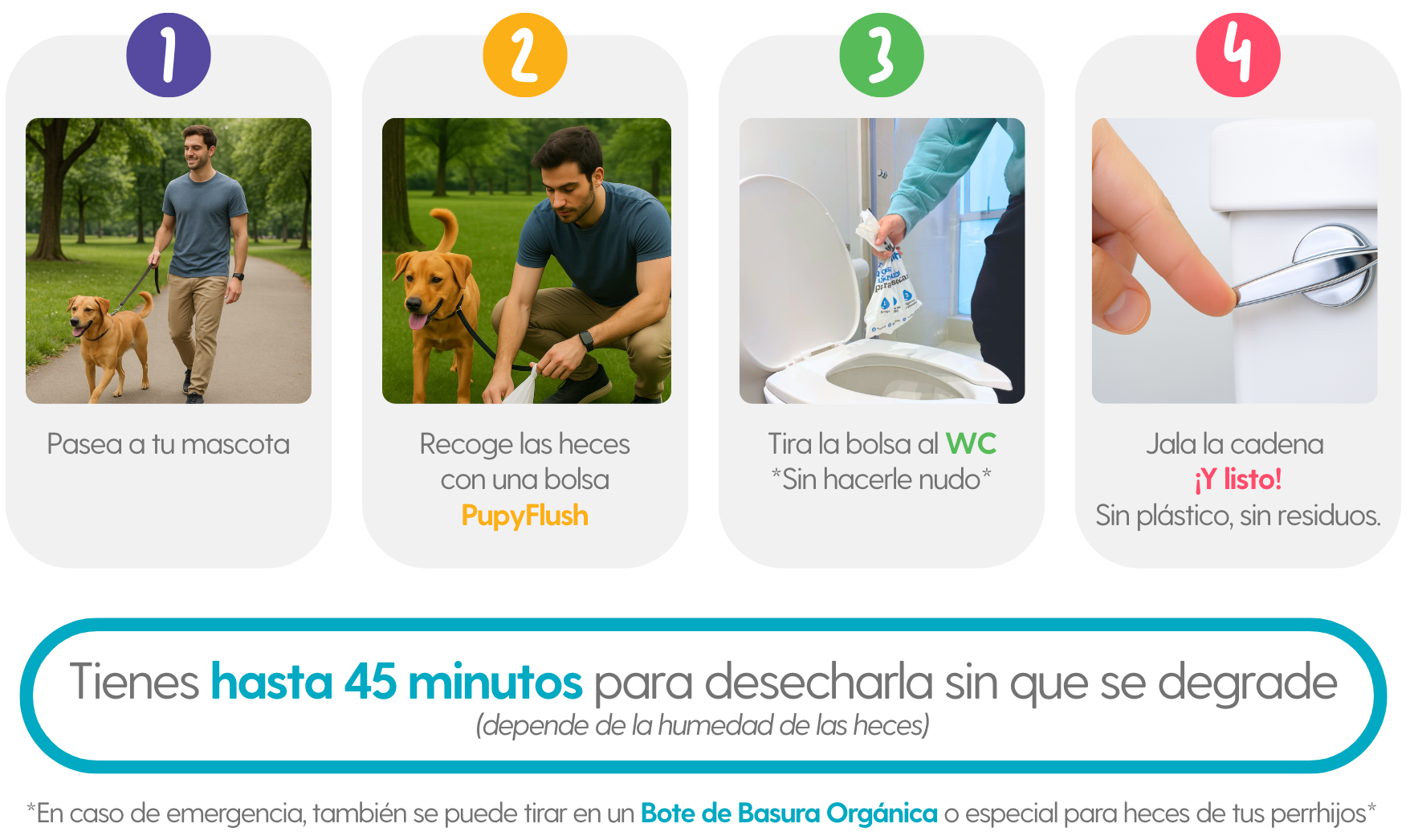Aproximadamente 45 minutos, dependiendo del nivel de humedad del excremento. Si se trata de un desecho completamente sólido, la bolsa puede resistir por más tiempo sin desintegrarse.